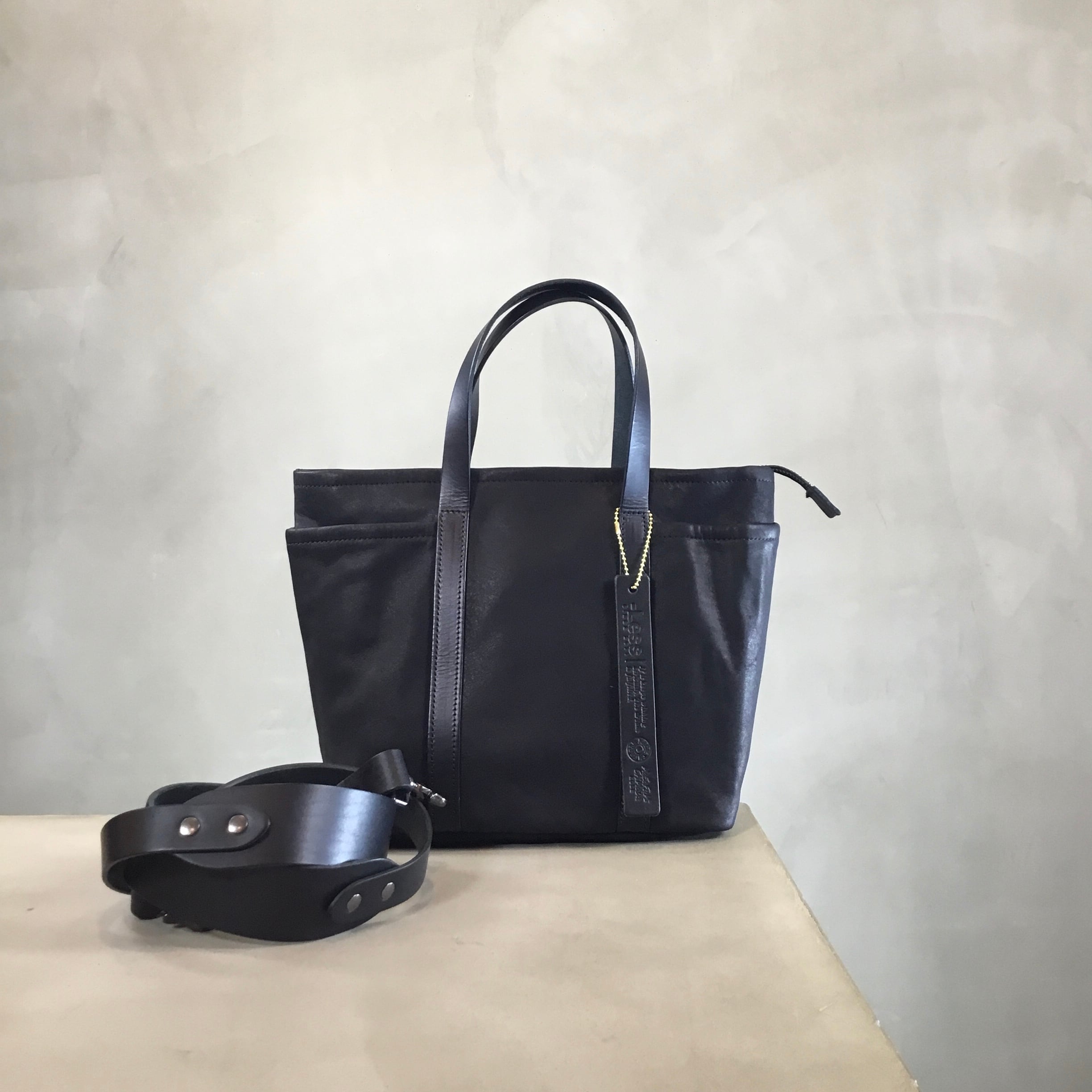 ショルダーベルト付き(取り外し可能)のトートバッグ。