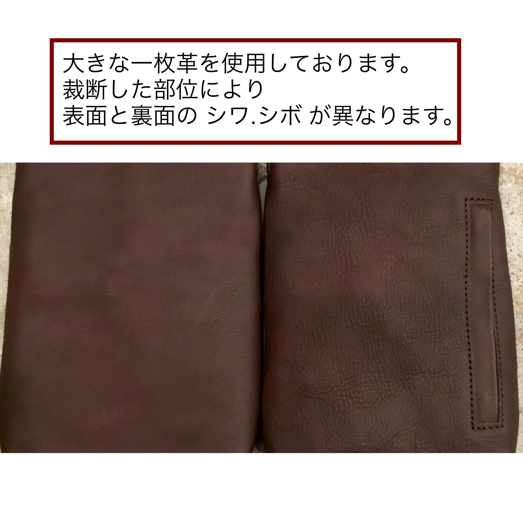生産の度に表面と裏面の革の表情は大きく異なります。